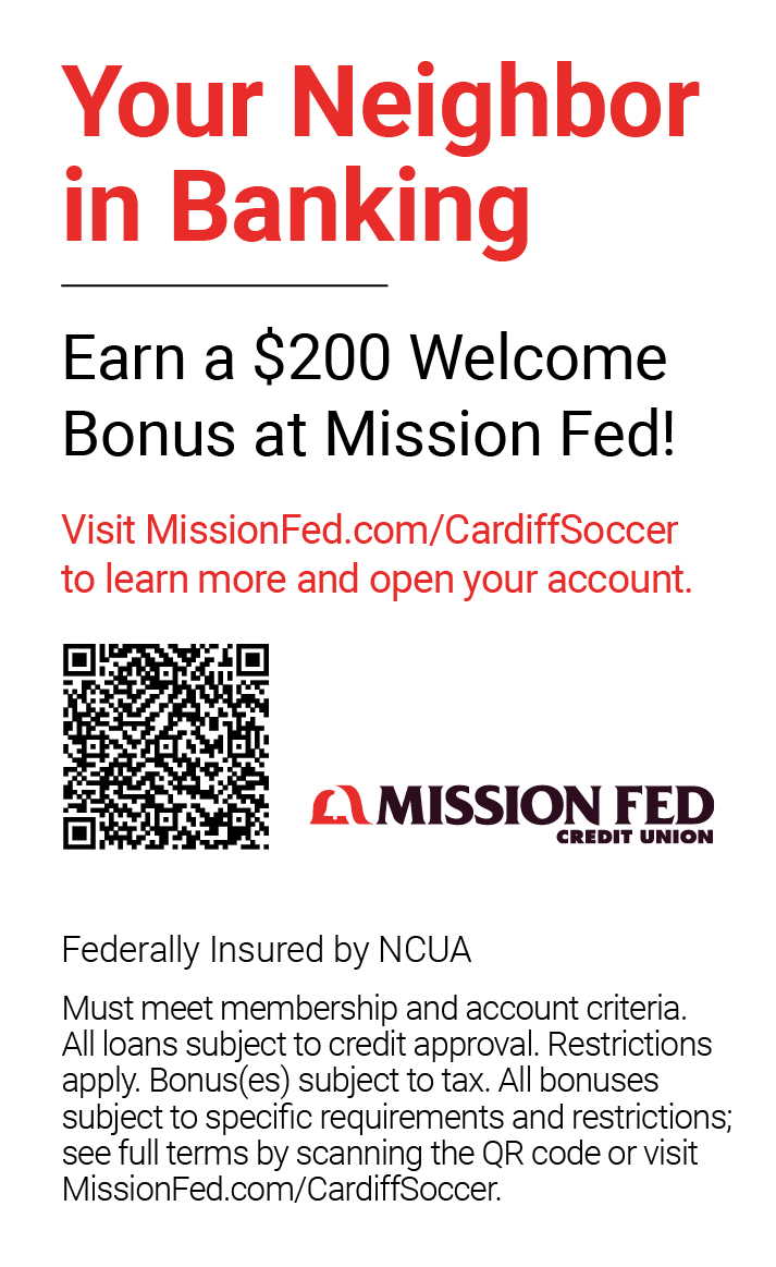 Cardiff Soccer families can now earn a $200 Welcome Bonus at Mission Fed!